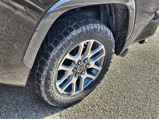 The brawny chiseled look of the Tundra is the ideal platform for the optional TRD Pro Off-Road Package. Model specific features include: split five-spoke TRD Off-Road Package alloy wheels with black accents and all-terrain P275/65R18 tires, trail-tuned Bilstein shock absorbers, engine skid plate, fuel tank skid plate, front tow hooks, LED fog lights (SR5), TRD Off Road floor mats (SR5/Limited), and bed side TRD Off-Road decal.