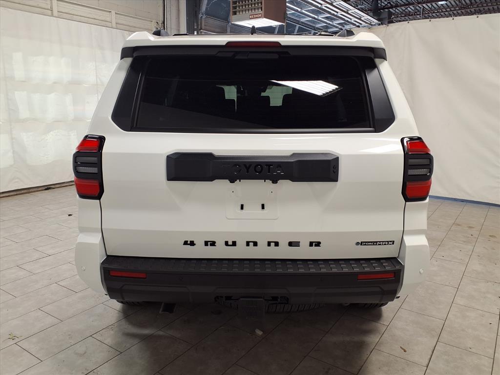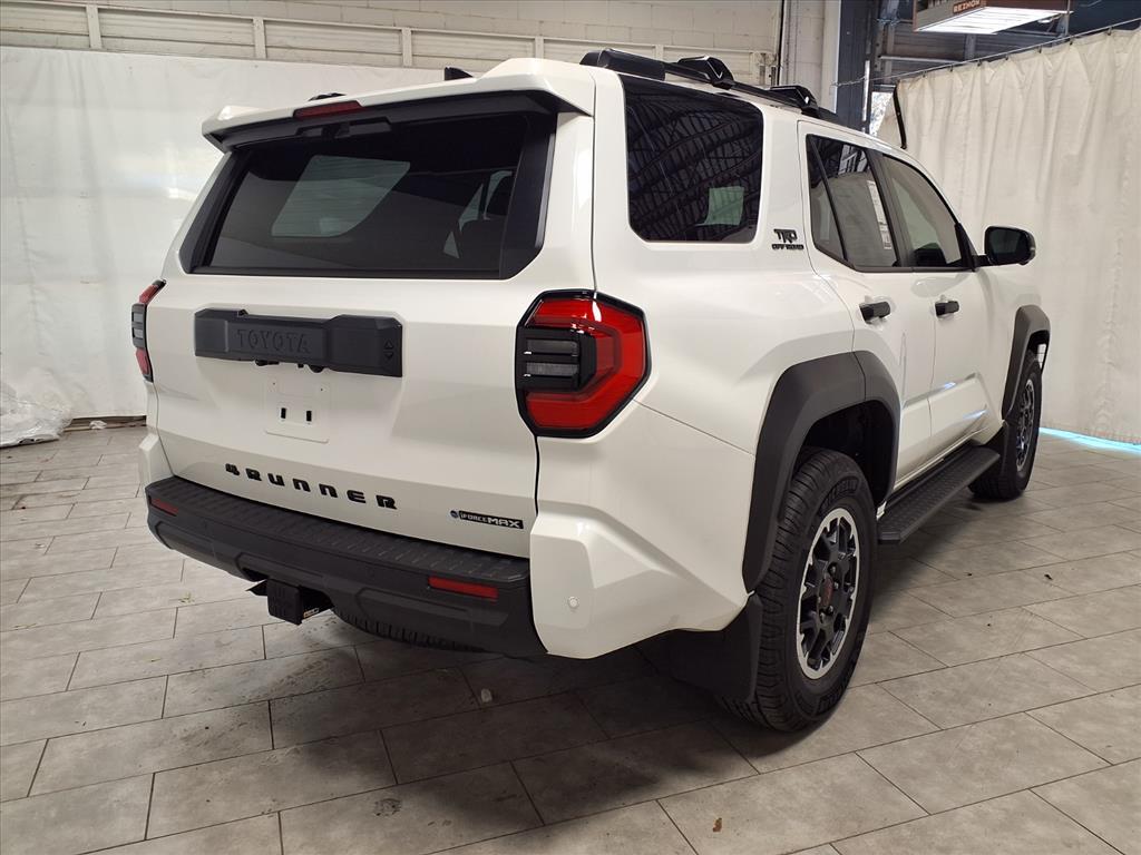Ice 2025 Toyota 4Runner i-FORCE MAX Hybrid TRD Off Road Premium 4WD 8-Speed Automatic 2.4L I4 FI Hybrid Turbocharged DOHC 16V 2.4L I4 FI Hybrid Turbocharged DOHC 16V. BLUETOOTH, BACKUP CAMERA, APPLE CARPLAY. This vehicle comes equipped with: Tow Technology Package, TRD Offroad Premium Package, 2.4L I4 FI Hybrid Turbocharged DOHC 16V, 15 Speakers, 4-Wheel Disc Brakes, ABS brakes, Air Conditioning, Alloy wheels, AM/FM radio: SiriusXM, Anti-whiplash front head restraints, Apple CarPlay/Android Auto, Auto High-beam Headlights, Automatic temperature control, Brake assist, Bumpers: body-color, Color Keyed Bodyside Molding (TMS), Driver door bin, Driver vanity mirror, Dual front impact airbags, Dual front side impact airbags, Electronic Stability Control, Emergency communication system: Safety Connect (1-year trial), Exterior Parking Camera Rear, Front & Rear Molded Black 4Runner Mudguards (TMS), Front anti-roll bar, Front Bucket Seats, Front Center Armrest, Front dual zone A/C, Front fog lights, Front reading lights, Front wheel independent suspension, Heated & Ventilated Front Bucket Seats, Heated door mirrors, Illuminated entry, Interior D-Pillar Cargo Lights (TMS), Knee airbag, Leather Shift Knob, Leather steering wheel, Low tire pressure warning, Memory seat, Moonroof, Navigation System, Occupant sensing airbag, Outside temperature display, Overhead airbag, Overhead console, Panic alarm, Passenger door bin, Passenger vanity mirror, Power door mirrors, Power driver seat, Power passenger seat, Power steering, Power windows, Prewired Auxiliary Switches, Radio: 14Audio, Rear anti-roll bar, Rear seat center armrest, Rear side impact airbag, Rear window defroster, Rear window wiper, Remote keyless entry, Security system, SofTex Seat Trim, Speed control, Speed-sensing steering, Split folding rear seat, Spoiler, Steering wheel mounted audio controls, Tachometer, Telescoping steering wheel, Tilt steering wheel, Traction control, Trip computer, Variably intermittent wipers, and Wheels: 18Matte-Black Painted Alloy.