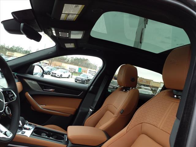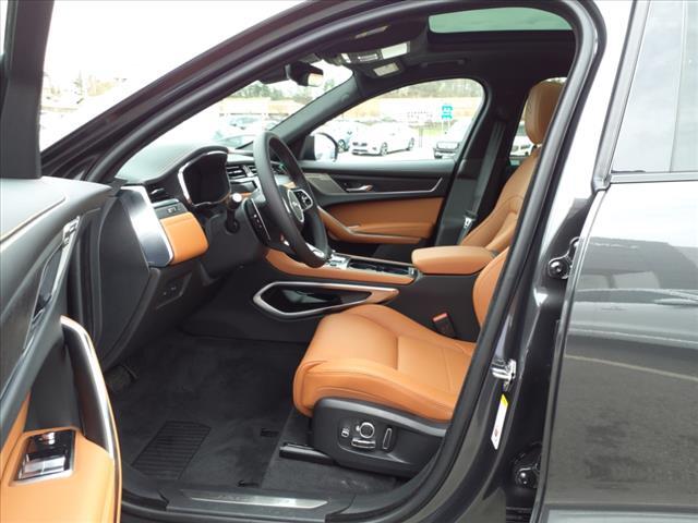 Inside the passenger compartment, the 'Sports Command' driving position provides authoritative, confidence-inspiring outward visibility, while retaining the Jaguar-specific sports car feel; the dramatic curve of the front door top is incorporated into the dash fascia enhancing the cockpit-like feel. The vehicle's available leather sports seats are shaped to provide exceptional comfort and support; they are available with 14 different adjustments plus heating and cooling functions. A range of contemporary trim options are also available, including authentic metal finishes such as Meshed Aluminum and beautiful crafted veneers such as Satin Grey Ash.